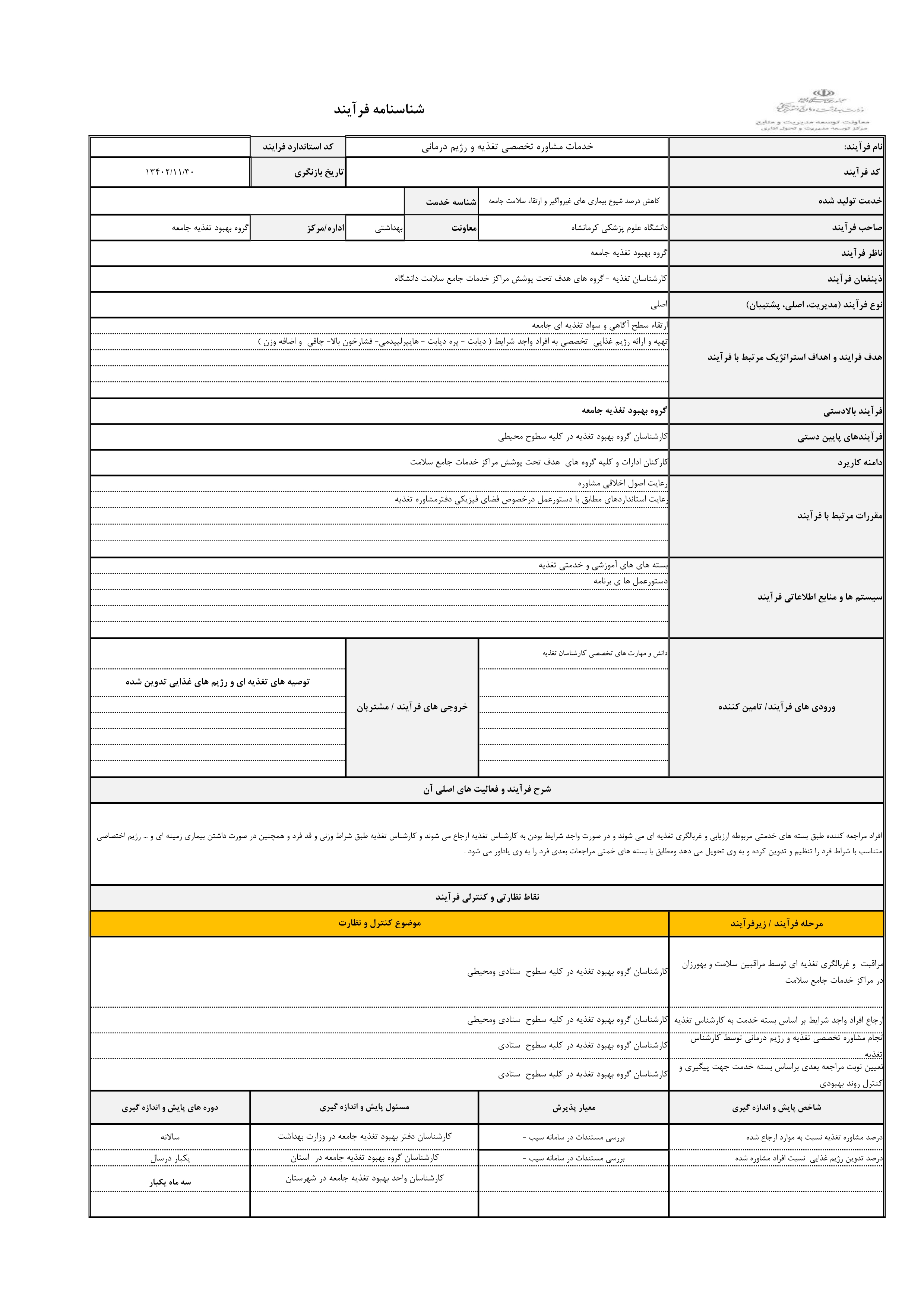 فرآیند خدمات مشاوره تخصصی تغذیه و رژیم درمانی